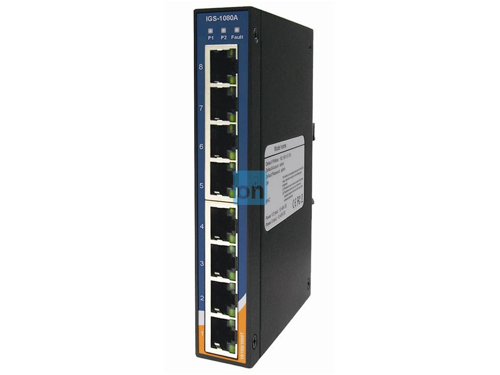 DIN Switch GE, úzké provedení, neřiditelný, 8x 10/100/1000TX (RJ-45), dvojité 12~48VDC, -40 ~70C
